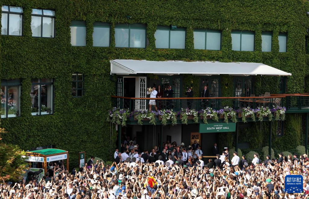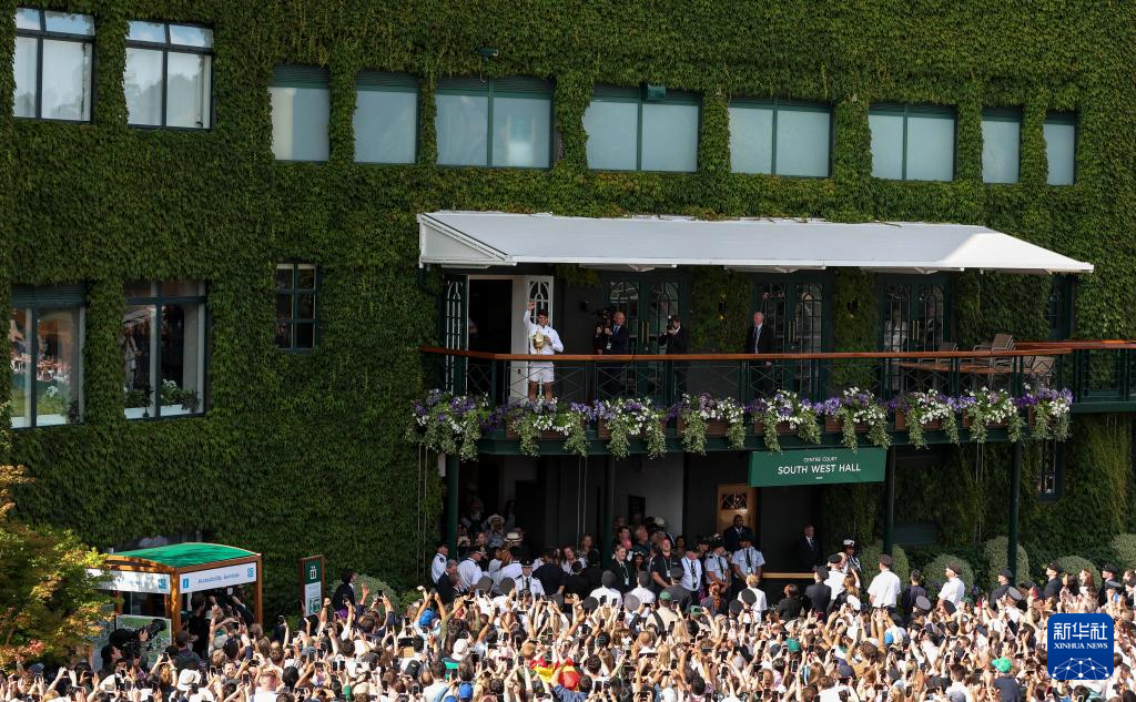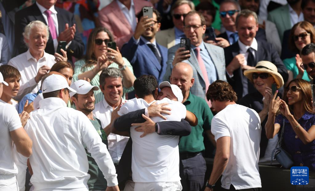 7月14日,阿尔卡拉斯在比赛后与亲友庆祝胜利。新华社记者 李颖 摄