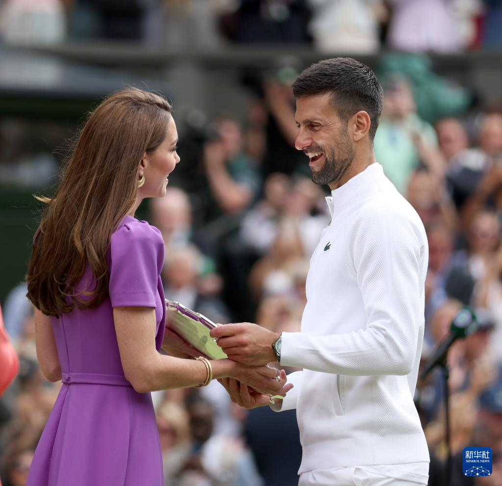 7月14日,英国凯特王妃(左)为焦科维奇颁奖。新华社记者 李颖 摄
