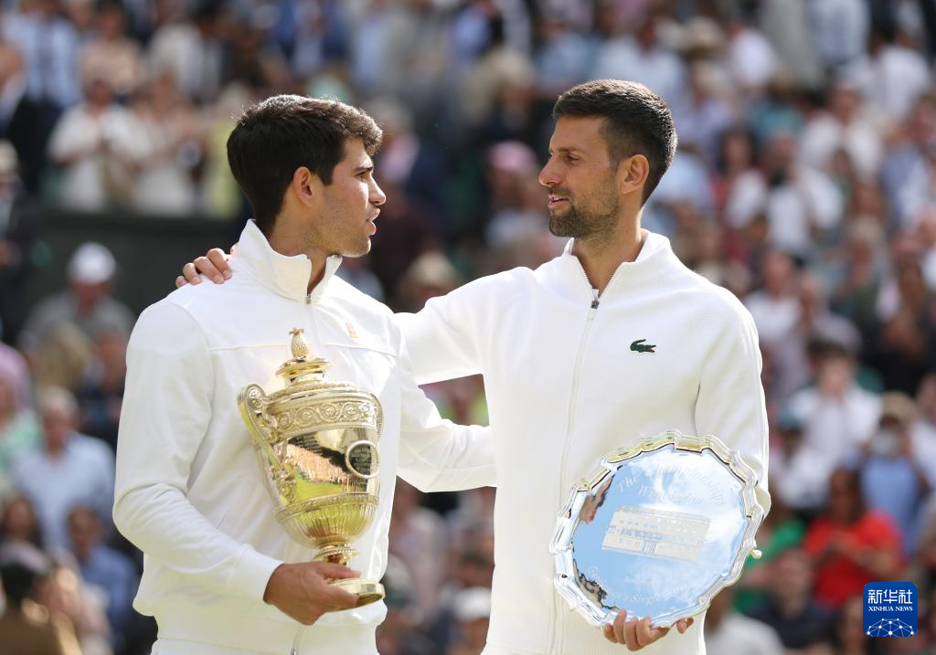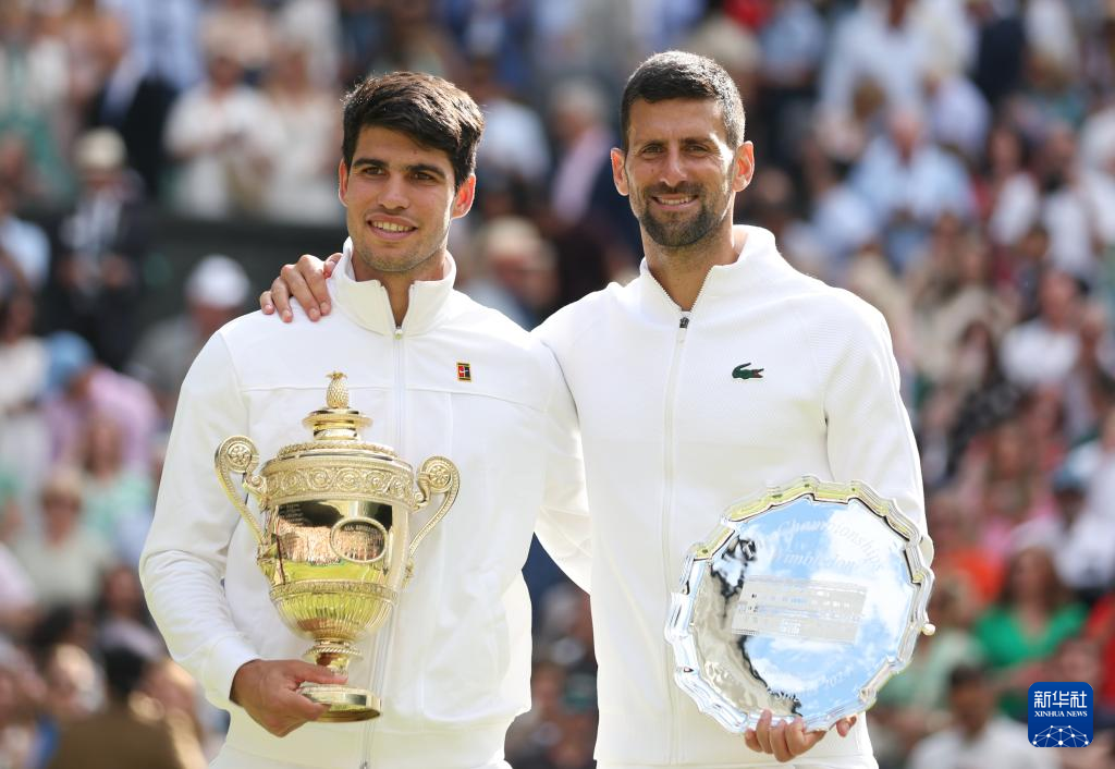 7月14日,阿尔卡拉斯(左)与焦科维奇在颁奖仪式上。新华社记者 李颖 摄