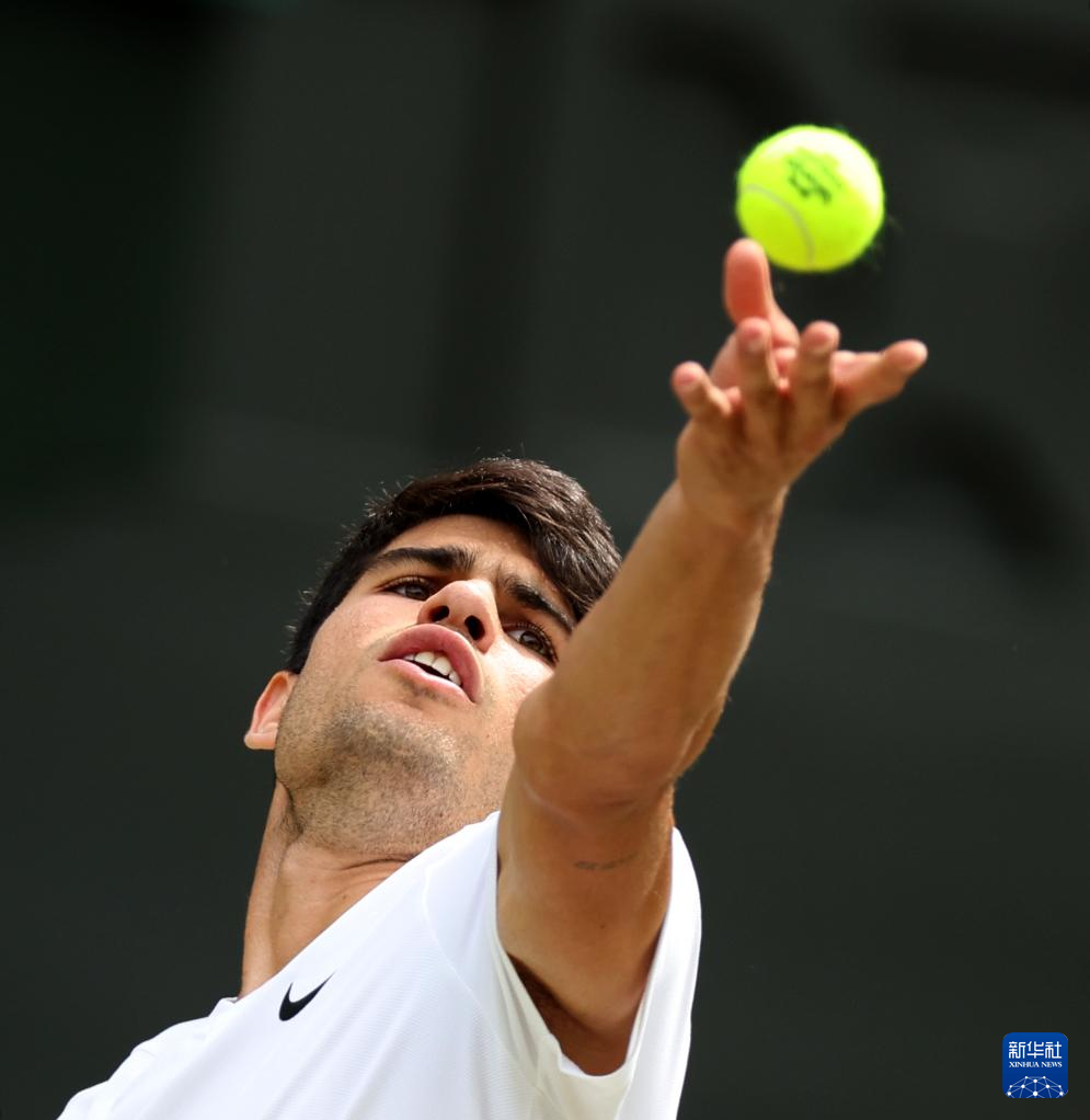 7月14日,阿尔卡拉斯在比赛中发球。新华社记者 李颖 摄