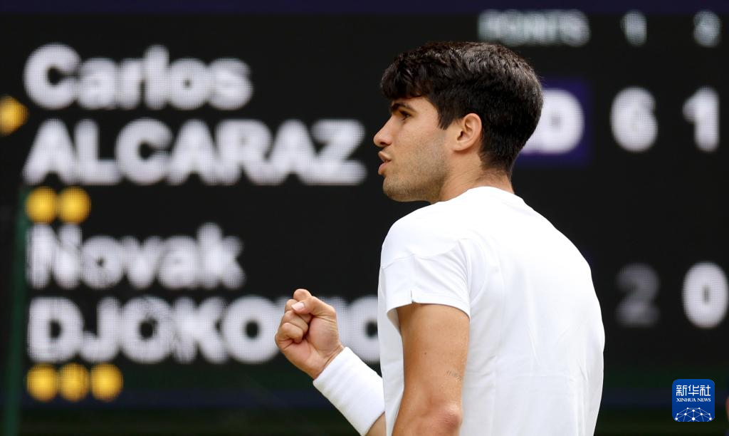 7月14日,阿尔卡拉斯在比赛中庆祝得分。新华社记者 李颖 摄