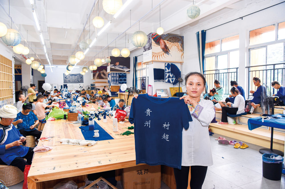 石本然所在的特和社区“母亲回家”手工坊,与村超相关的文创产品都很畅销,足球、包包、围巾、鞋子……很多日常用品都被融入村超、蜡染、刺绣等元素。这家手工坊的总经理助理于海峰介绍,村超“出圈”以来,各类文创产品销量增长了20%以上。