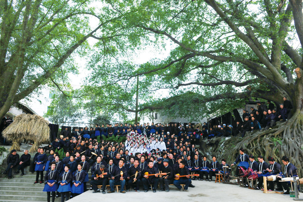 乐乡侗寨的古榕树下,400余名男女歌手汇聚一堂,歌唱着流传了几百年的侗家牛腿琴歌。新华社发(吴江平 摄)