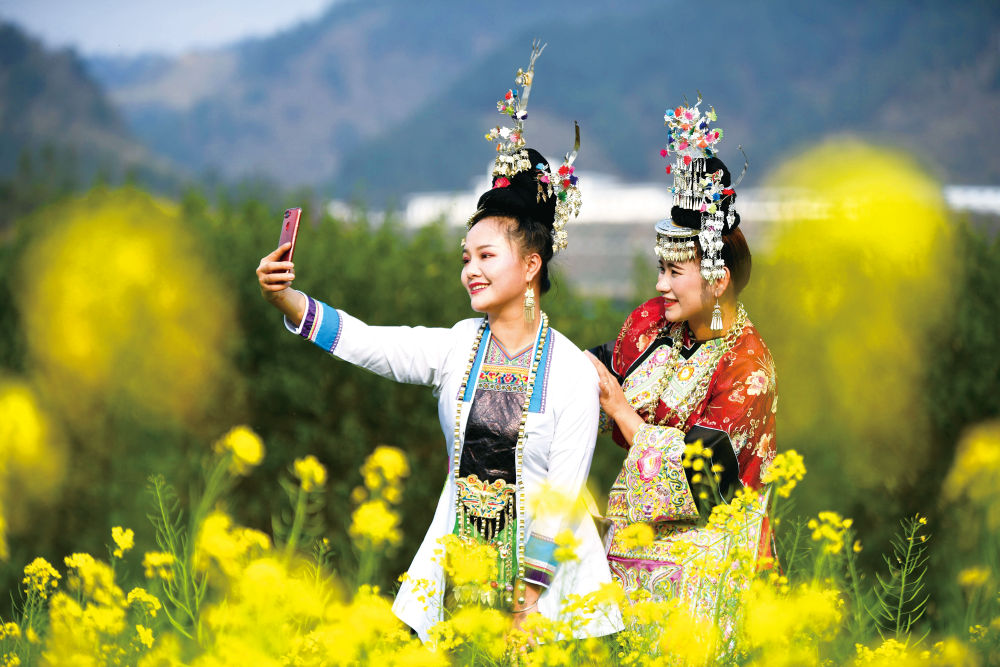 盛装打扮的侗族姑娘在榕江县乐乡侗寨油菜花田间自拍。 新华社发