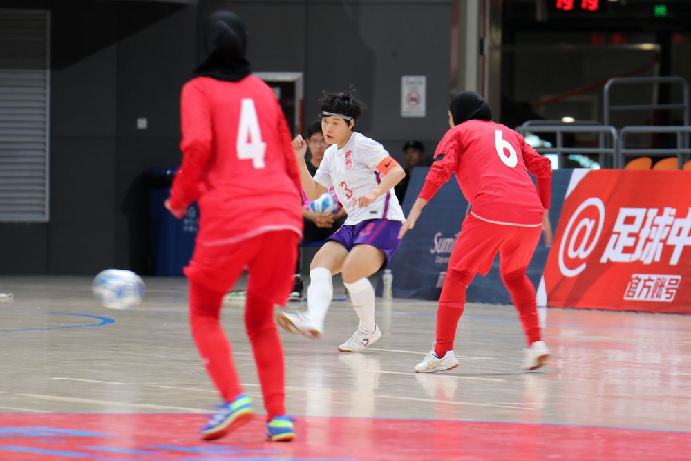 7月15日,中国队球员战慧敏(中)在比赛中。当日,在兰州奥体中心进行的2024中国足球协会“兰州奥体”杯女子五人制足球国际邀请赛最后一场比赛中,中国队1比5负于伊朗队。新华社记者 范培珅 摄