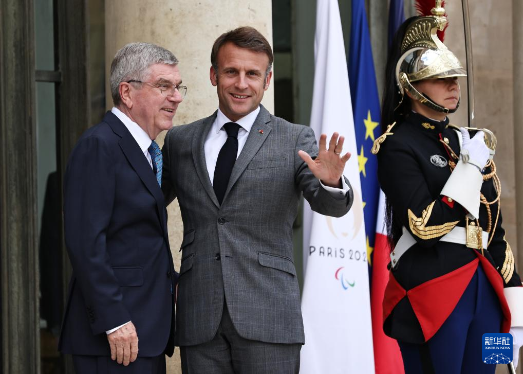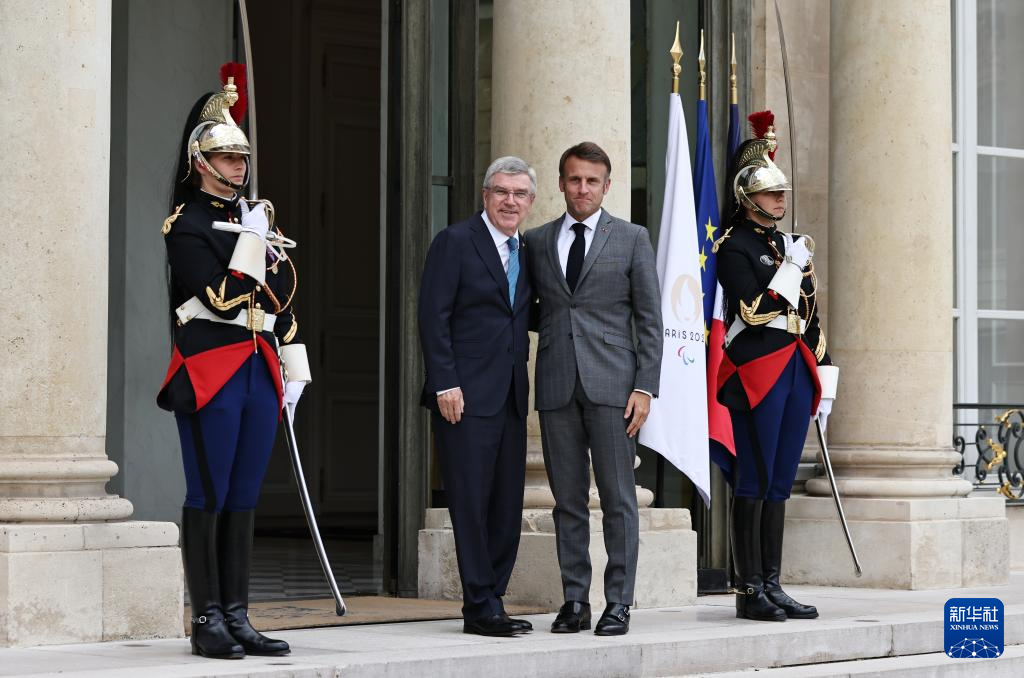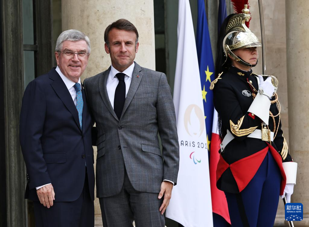 7月16日,法国总统马克龙(中)在巴黎总统府爱丽舍宫会见来访的国际奥委会主席巴赫(左)。新华社记者 高静 摄