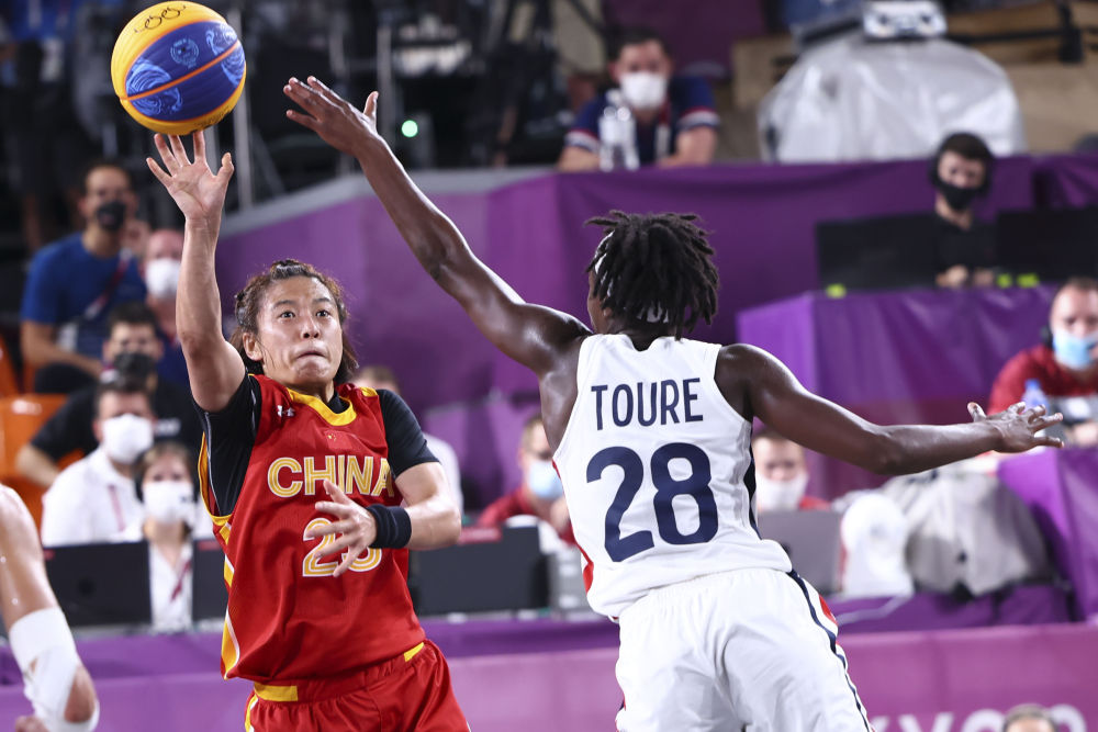 2021年7月28日,王丽丽(左)在比赛中拼抢。当日,在东京奥运会三人篮球女子组铜牌争夺赛中,中国队战胜法国队获得铜牌。新华社记者兰红光摄
