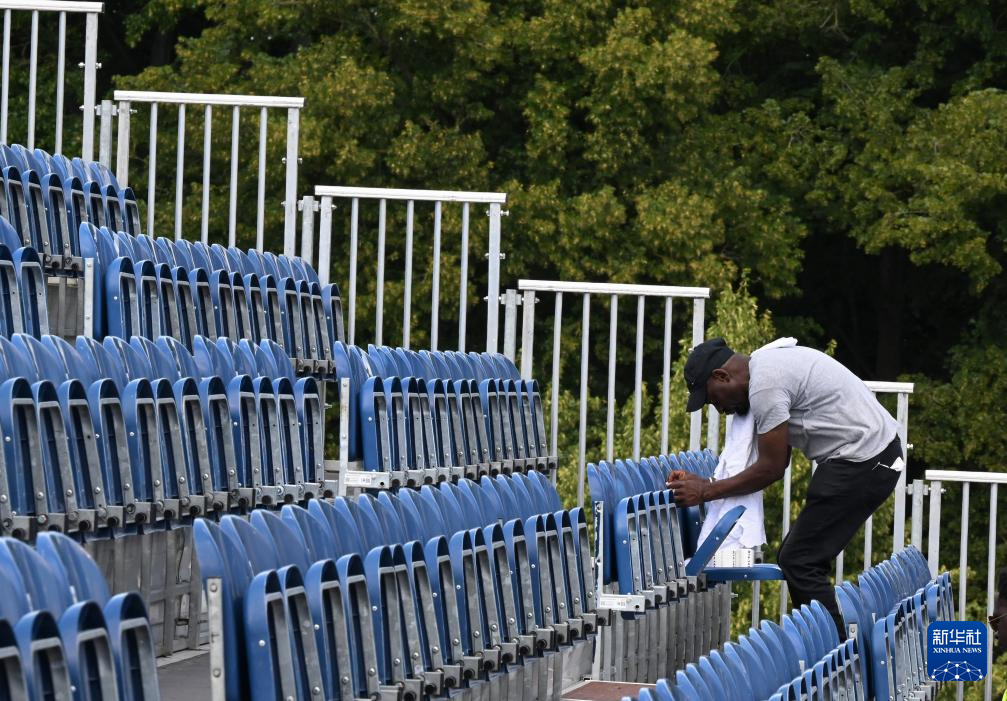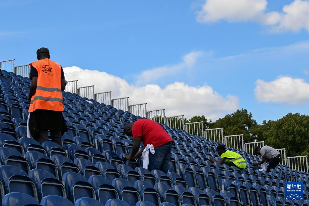 7月17日,工作人员在观众看台给座位粘贴标识。新华社记者 贺长山 摄