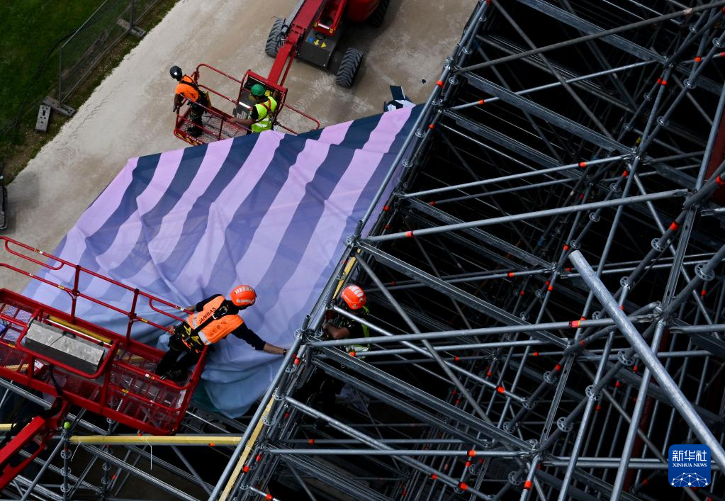 7月17日,工作人员在马术赛场悬挂奥运会幕布。新华社记者 贺长山 摄