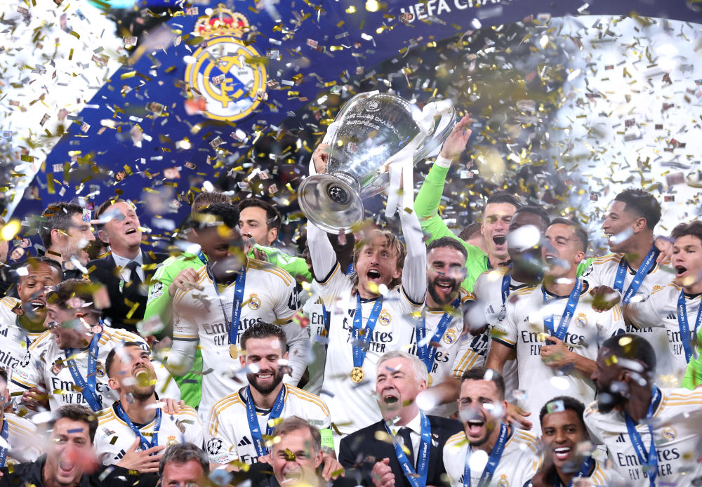 6月1日,皇家马德里队球员莫德里奇(中)在颁奖仪式上捧杯庆祝。当日,在英国伦敦举行的2023-2024赛季欧洲足球冠军联赛决赛中,西甲皇家马德里队2:0战胜德甲多特蒙德队,夺得冠军。新华社发