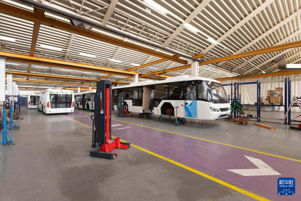这是6月14日在斯洛文尼亚马里博尔郊区的TAM欧洲商用车研发制造公司工厂拍摄的电动巴士生产线。新华社发(泽利科·斯特凡尼奇摄)