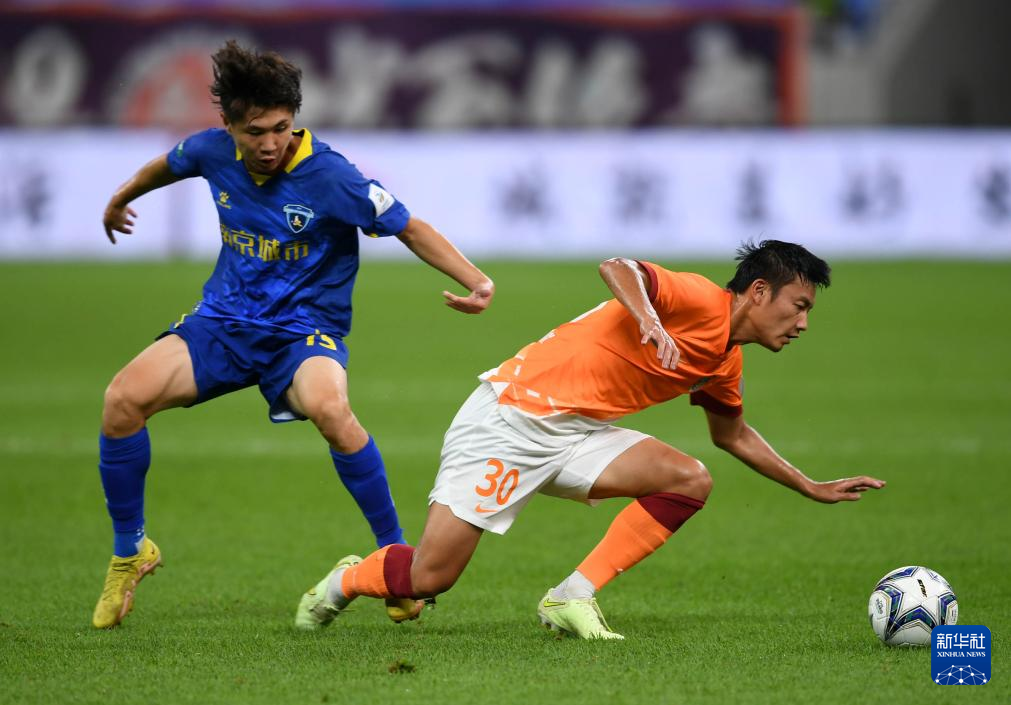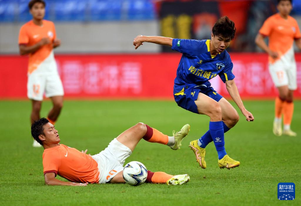 7月17日,青岛海牛队球员郑龙(左)与南京城市队球员孟振拼抢。新华社记者 李紫恒 摄
