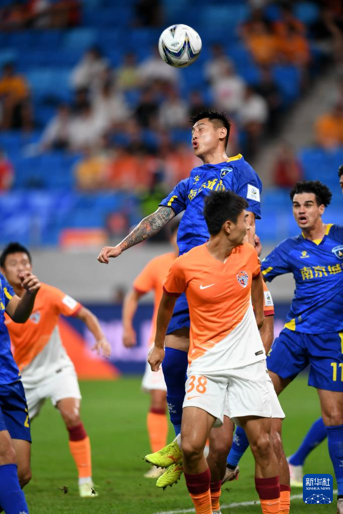 7月17日,青岛海牛队球员张威(左一)在比赛中与南京城市队球员拼抢。新华社记者 李紫恒 摄