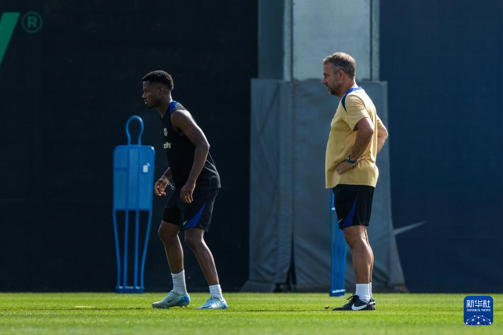 7月19日,巴塞罗那队主帅汉斯·弗利克(右)与球员安苏·法蒂在训练课上。新华社发(胡安·戈萨摄)