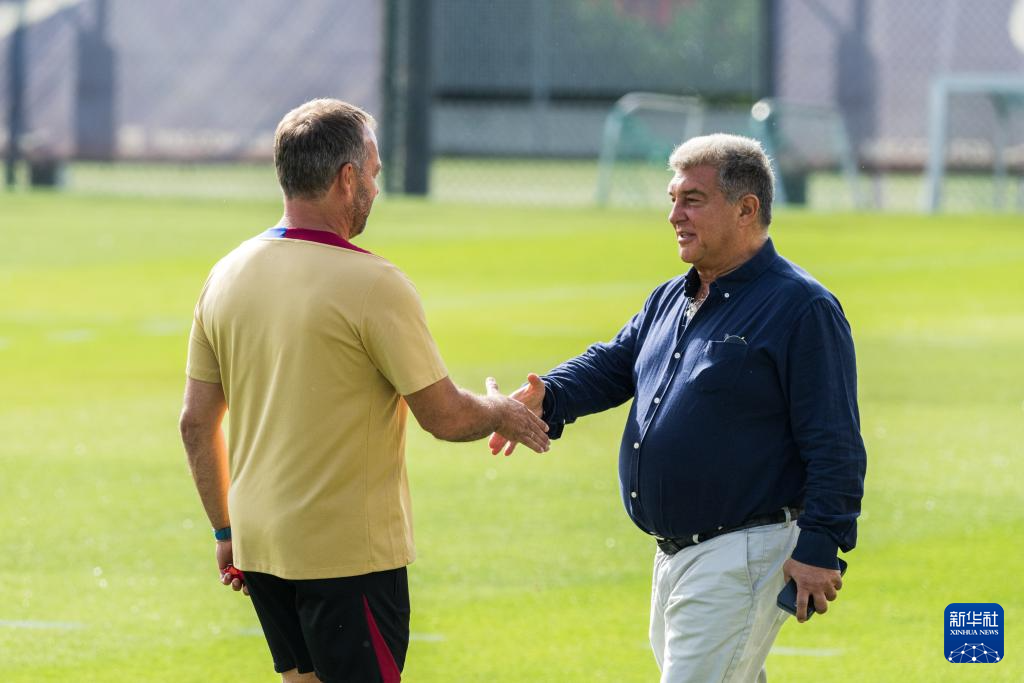 7月19日,巴塞罗那队主帅汉斯·弗利克(左)在训练场上与俱乐部主席拉波尔塔握手。新华社发(胡安·戈萨摄)