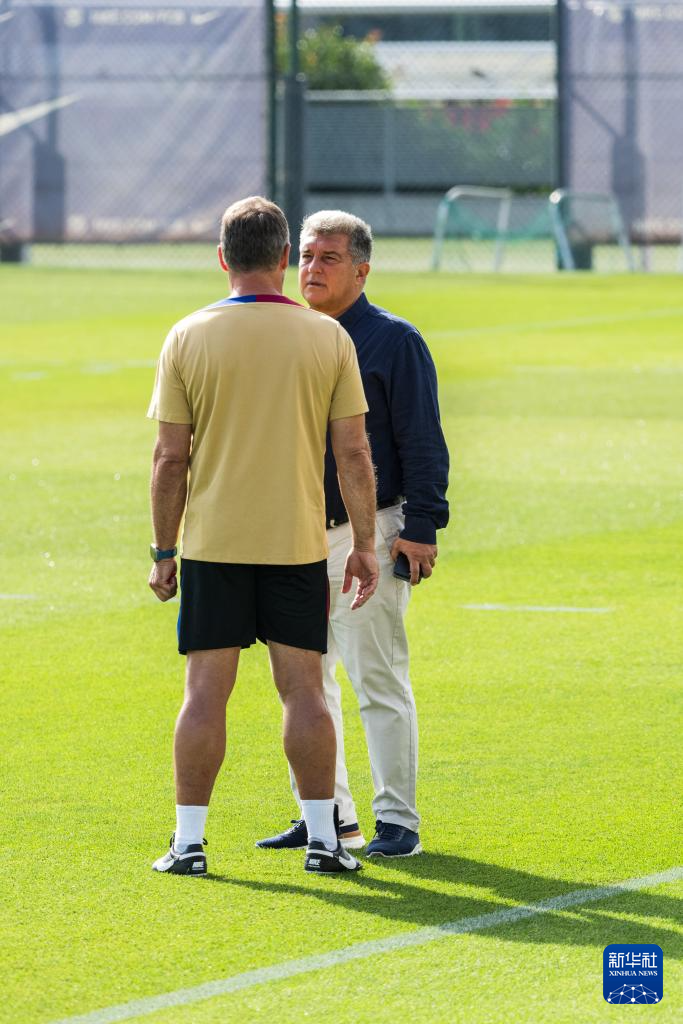 7月19日,巴塞罗那队主帅汉斯·弗利克(左)在训练场上与俱乐部主席拉波尔塔交流。新华社发(胡安·戈萨摄)