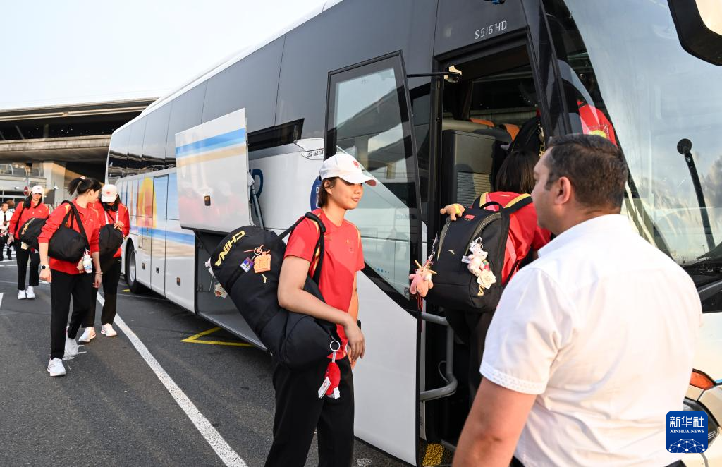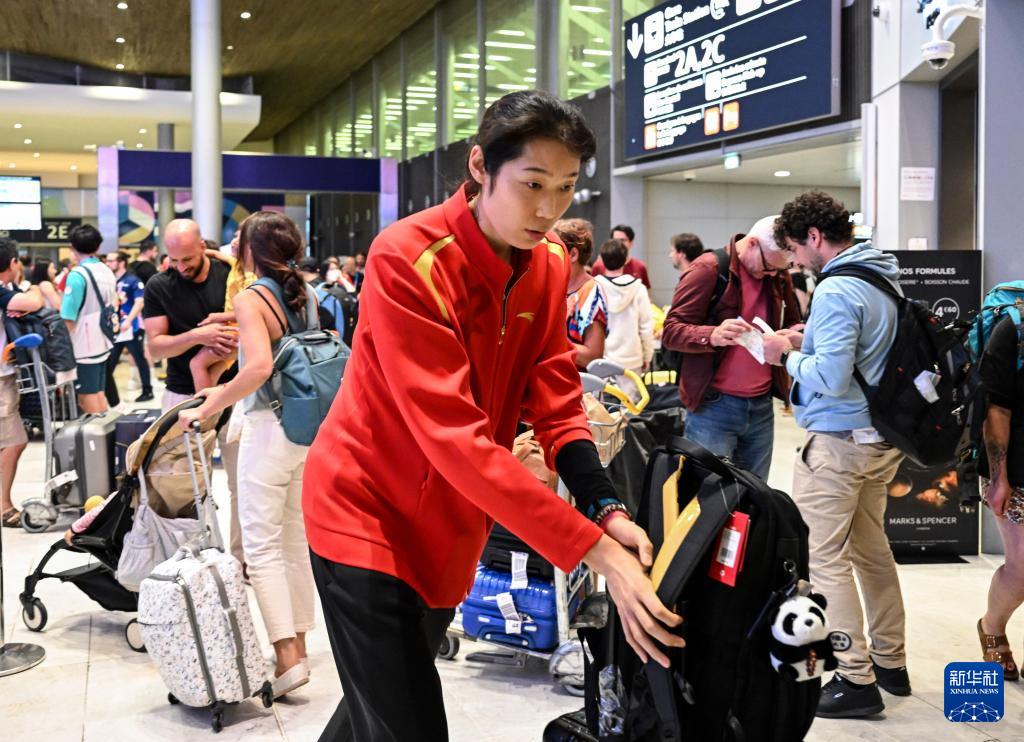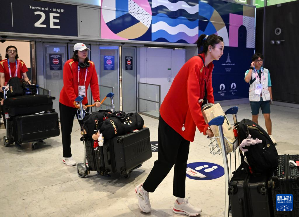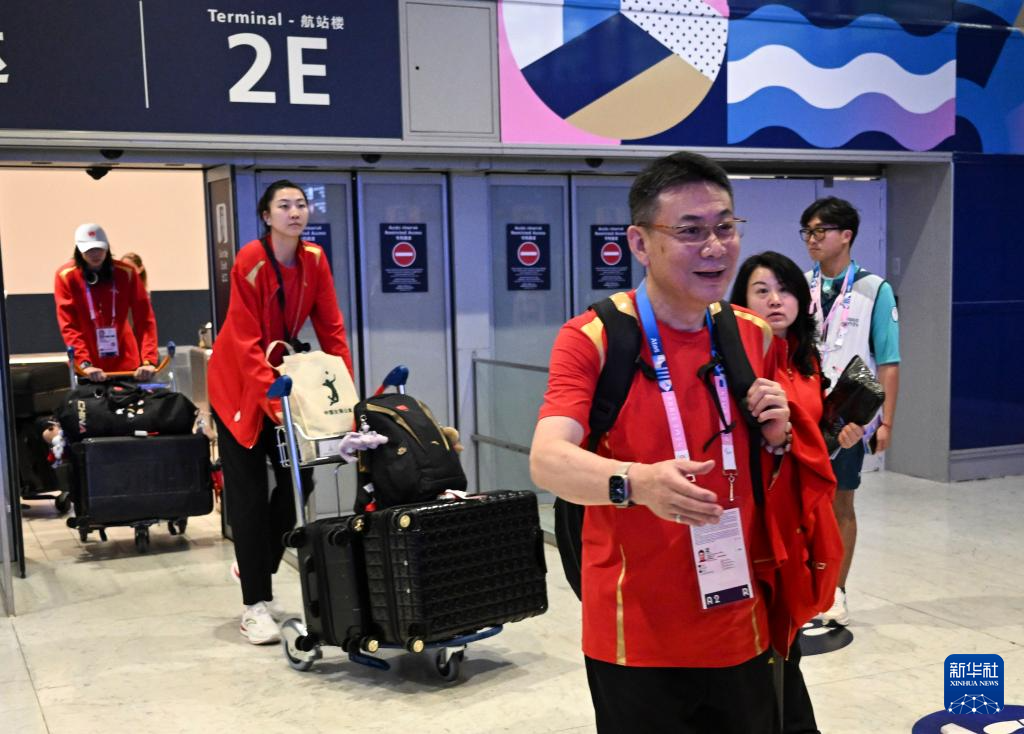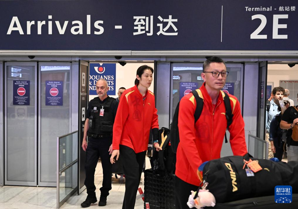 当日,参加巴黎奥运会的中国女排成员抵达法国巴黎戴高乐机场。