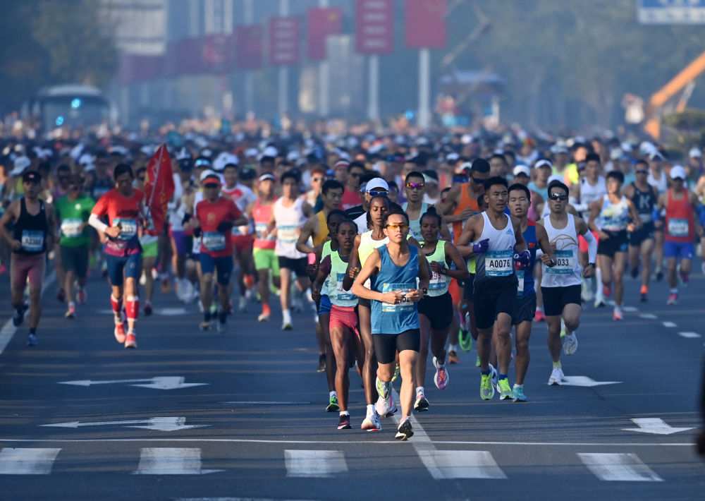2023年10月15日天津马拉松鸣枪开跑,赛事设有马拉松、半程马拉松、健康跑(5公里)三个项目,来自世界各地的约3万名跑者参赛。新华社记者 赵子硕 摄