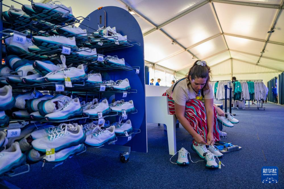 7月19日, 一名志愿者在装备分发中心内试穿鞋子。新华社记者 孙非 摄