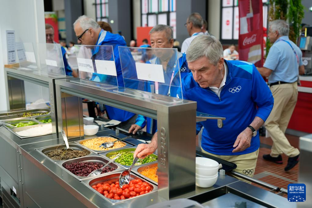 7月22日,国际奥委会主席巴赫(前)品尝奥运村内的食物。新华社发(Pool照片/大卫·戈德曼)