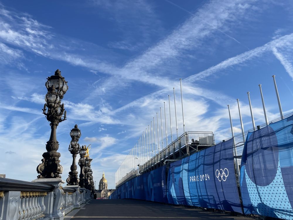 记者走到靠近大皇宫一侧的亚历山大三世桥口,荷枪实弹的警察站在铁门前,不允许任何人靠近。记者注意到,桥上的不锈钢坐席已搭建完毕,全部座位都面对埃菲尔铁塔方向。