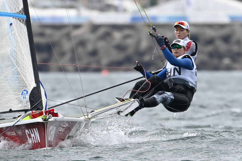 2021年7月27日,中国组合陈莎莎(后)/金晔在女子49人FX级比赛中。当日,东京奥运会帆船帆板比赛在日本神奈川县藤泽市江之岛游艇码头举行第三日的角逐。新华社记者 黄宗治 摄