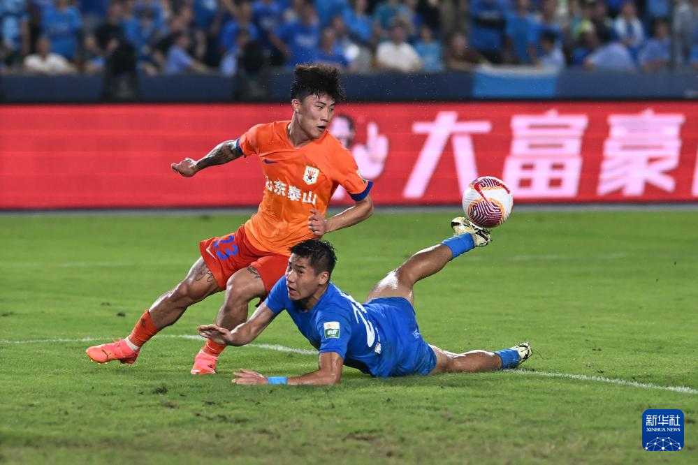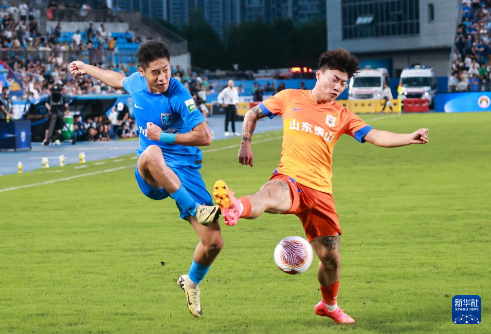 7月21日,南通支云队球员叶道驰(下)与山东泰山队球员谢文能在比赛中拼抢。新华社发(王须中摄)