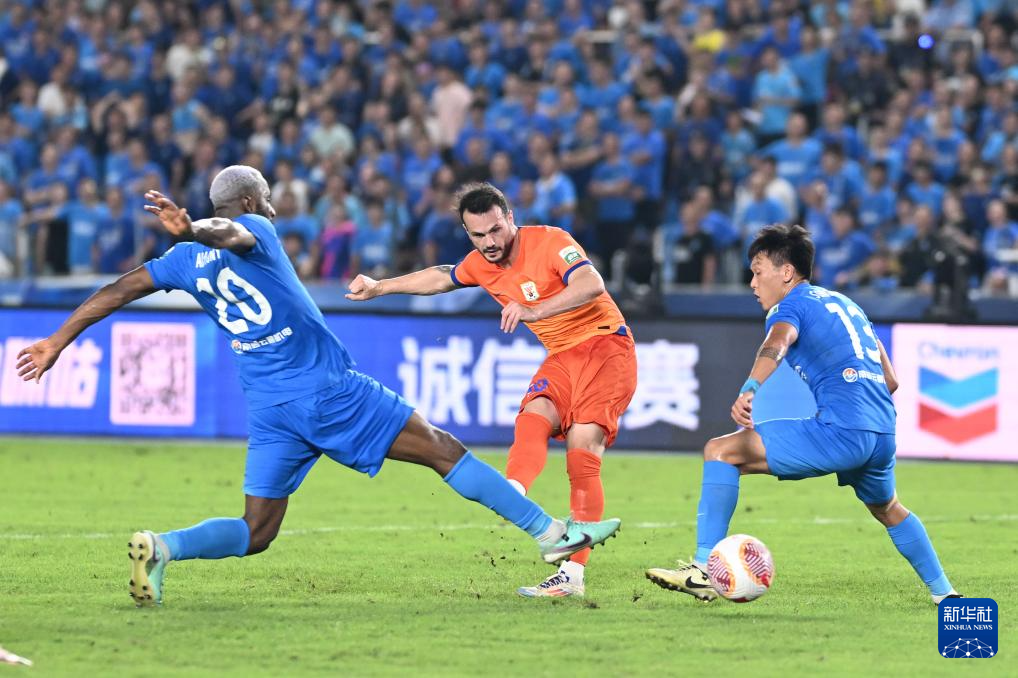 7月21日,山东泰山队球员克雷桑(左)在比赛中射门得分。新华社发(邱宇摄)