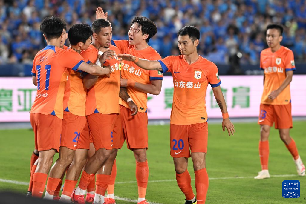 7月21日,山东泰山队球员克雷桑(右四)与队友在比赛中庆祝进球。新华社发(王须中摄)