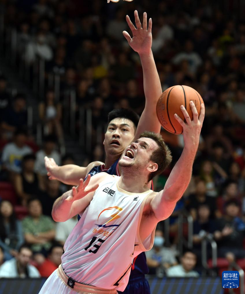 7月21日,合肥狂风峻茂队球员阿格拉瓦尼斯(左)在比赛中上篮。新华社记者 卢炳辉 摄