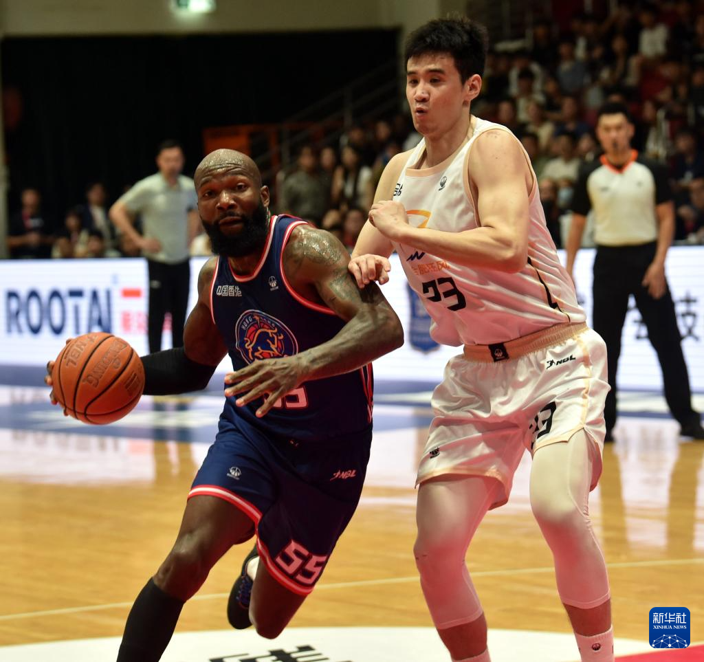 7月21日,合肥狂风峻茂队球员阿诺斯克(左)在比赛中面对香港金牛队球员朱松玮的防守。新华社记者 卢炳辉 摄