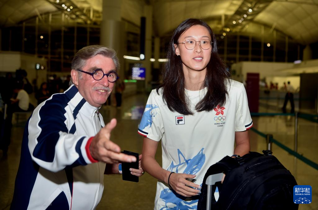 7月22日,中国香港体育代表团团长施文信(左)与游泳运动员谭凯琳在机场大厅候机。新华社记者 卢炳辉 摄