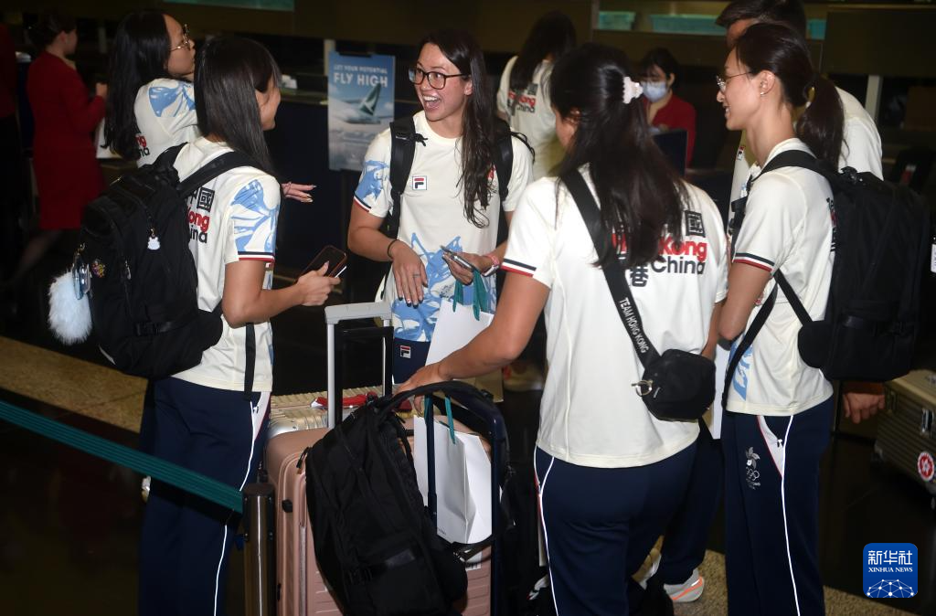 7月22日,中国香港体育代表团部分运动员在香港国际机场合影。新华社记者 卢炳辉 摄