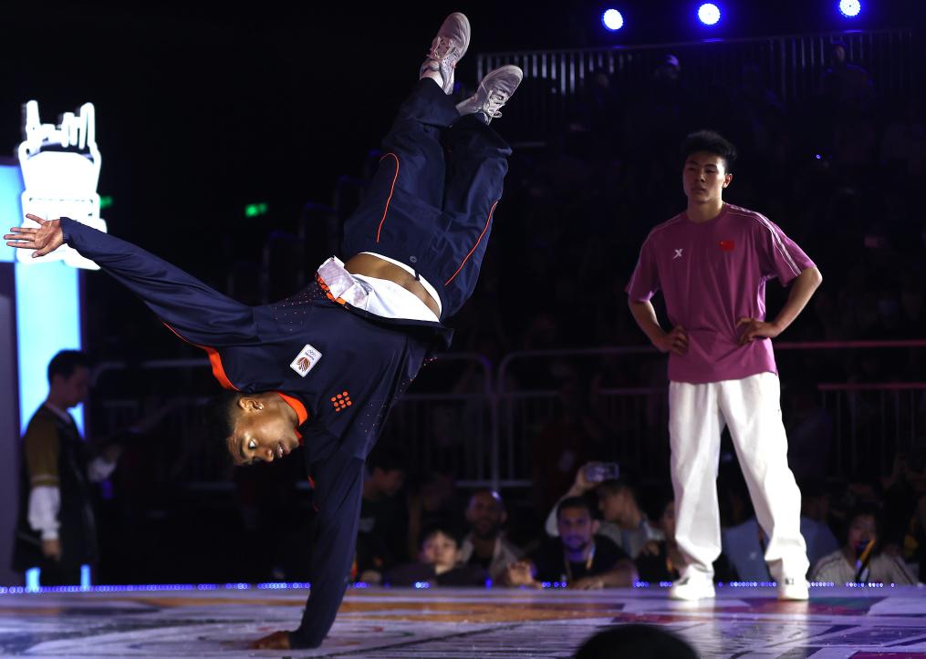 5月19日,荷兰选手迪乌夫(左)与中国选手亓祥宇在巴黎奥运会资格系列赛上海站霹雳舞男子决赛中。新华社记者 贾浩成 摄