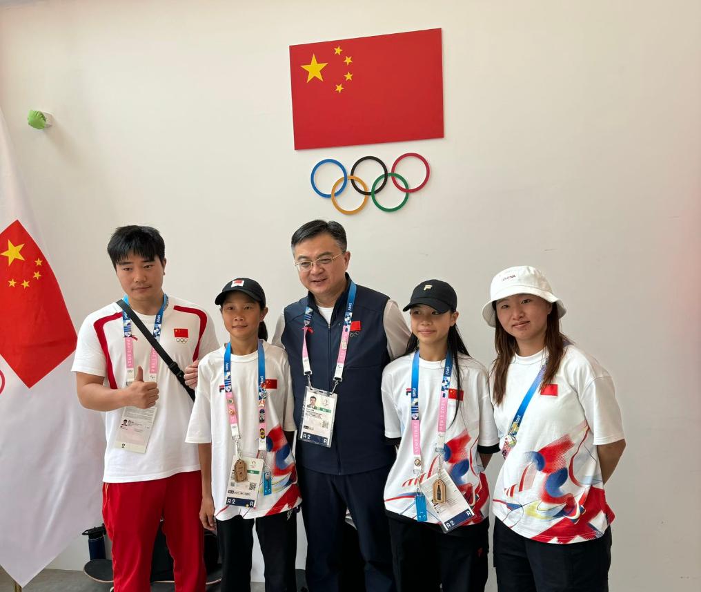 中国代表团楼下,我们还碰到了训练归来的三名滑板小将:14岁的崔宸曦、19岁的曾文蕙和13岁的朱沅铃,她们将参加女子街式的比赛。巴黎上午下雨,她们还坚持进行了训练。在楼门口悬挂的五星红旗和五环标志下,三人羞涩又自信地喊道:“中国队,加油!”