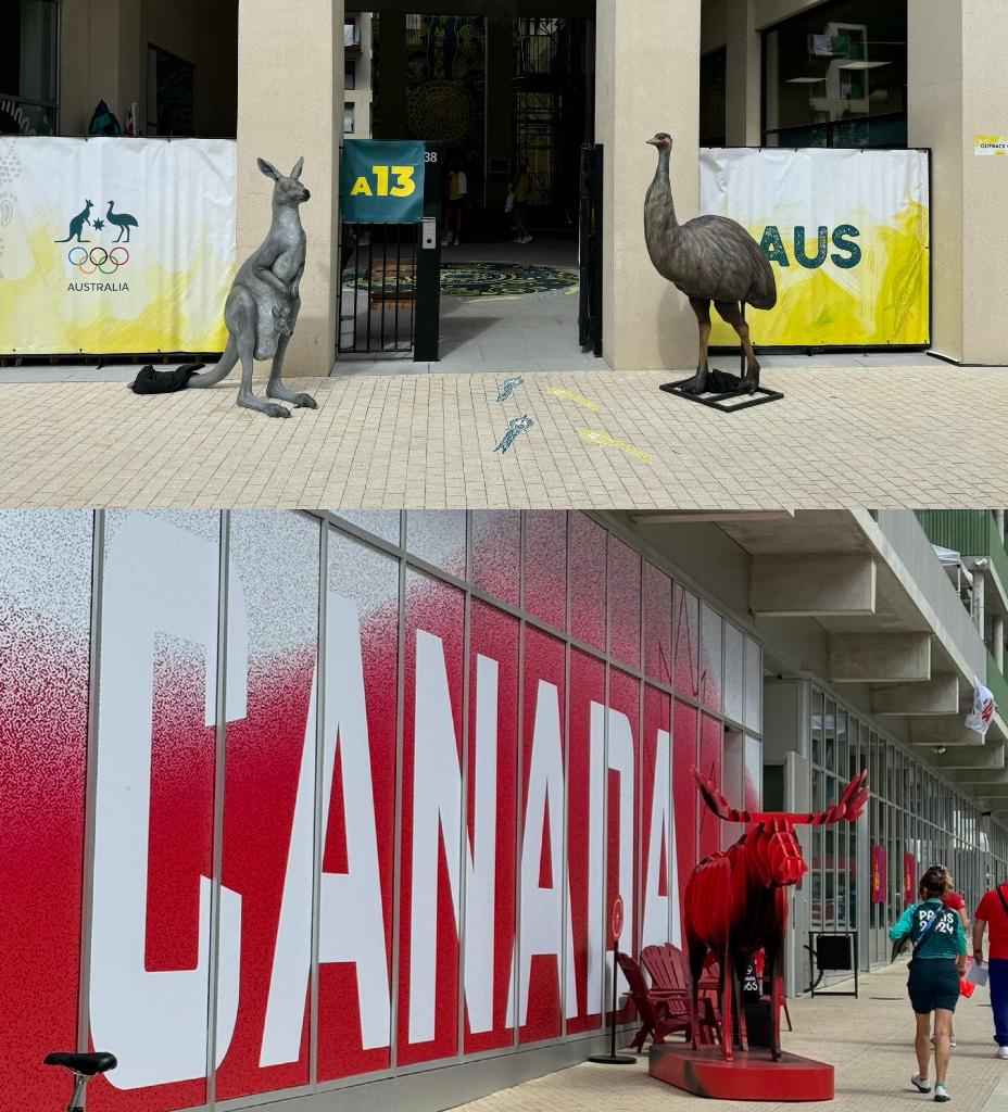 奥运村里一共80多栋楼,每栋楼上都挂着入住国家和地区的旗帜,有些代表团还在楼上装饰了很多艺术品。不过装饰动物的,除了中国代表团,我们只发现有澳大利亚和加拿大代表团:澳大利亚人在楼门口放了一只袋鼠和一只鸸鹋,加拿大代表团在楼下安置了一只红色的木制驯鹿。