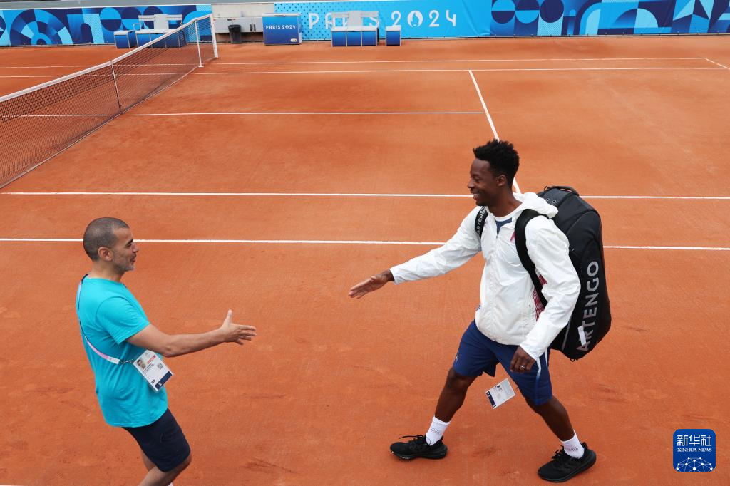 7月23日,在法国巴黎罗兰·加洛斯体育场,法国网球运动员孟菲斯(右)抵达球场训练。新华社记者 高静 摄