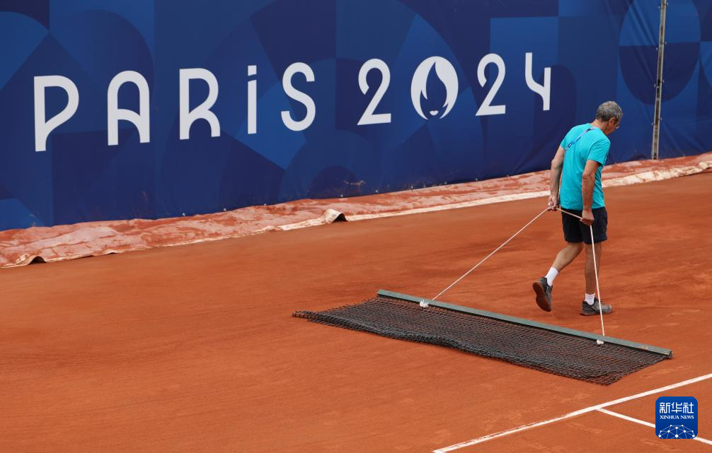 7月23日,在法国巴黎罗兰·加洛斯体育场,工作人员在整理红土场。新华社记者 高静 摄