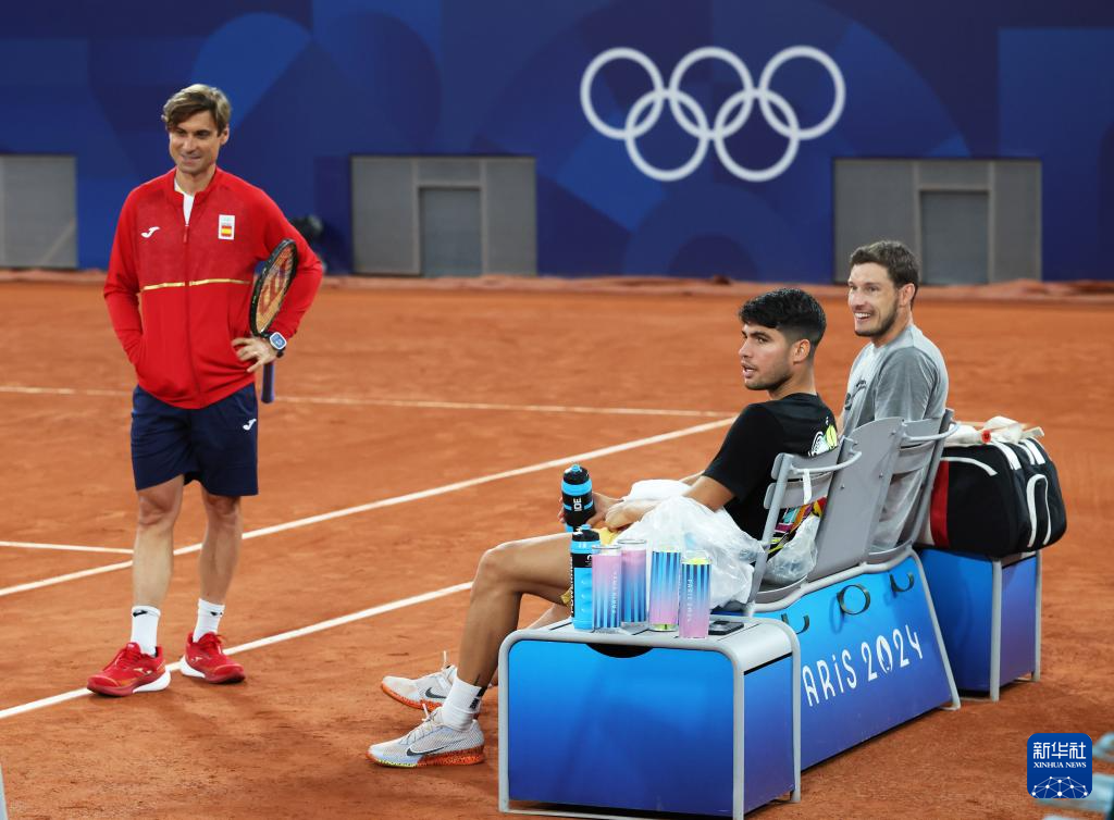 7月23日,在罗兰·加洛斯体育场中央球场——菲利普·夏蒂埃球场,西班牙名将阿尔卡拉斯(中)参加赛前训练。新华社记者 高静 摄