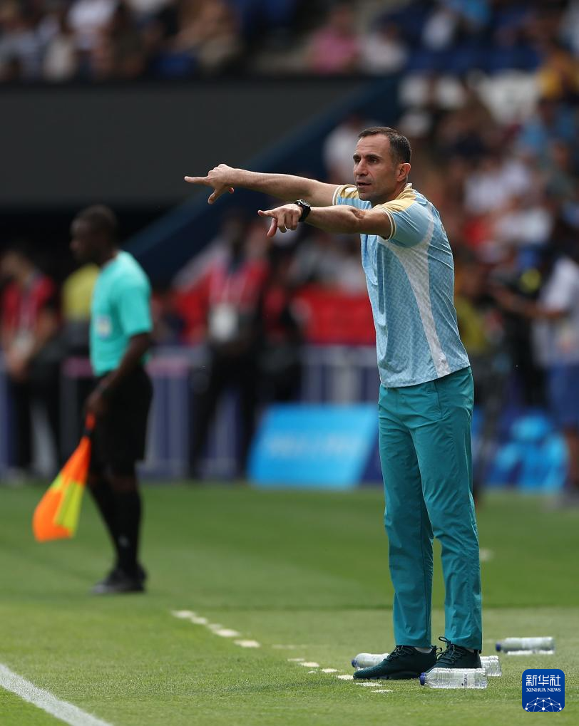 7月24日,乌兹别克斯坦队主教练卡帕泽(右)在场边指挥。