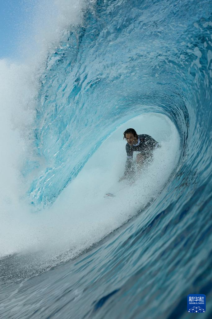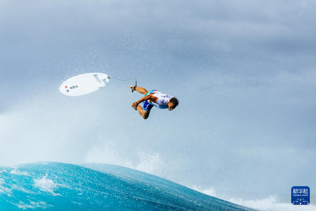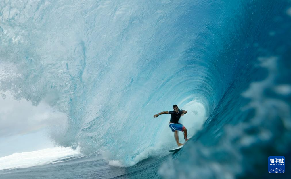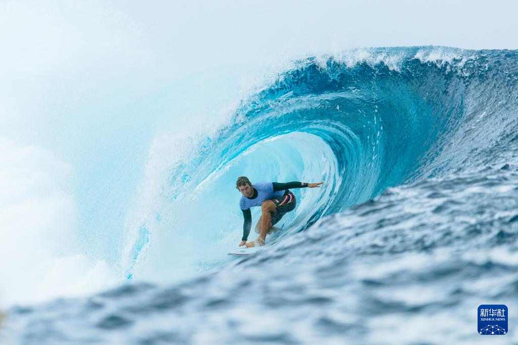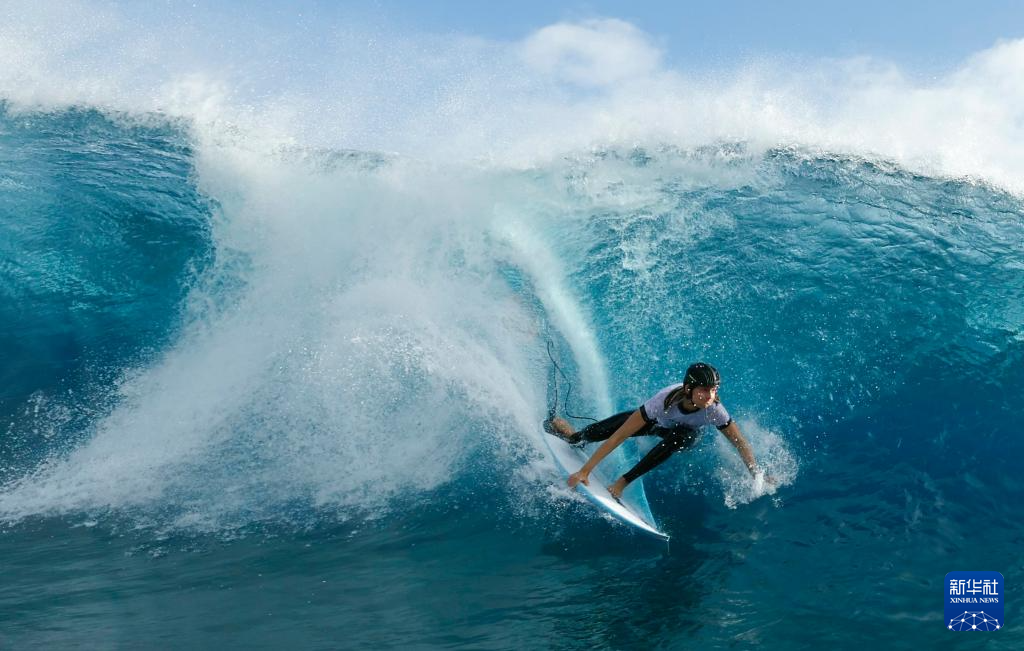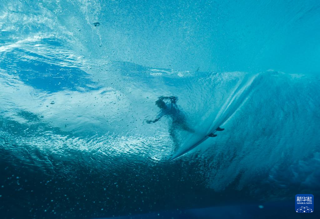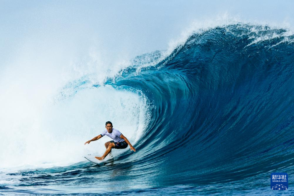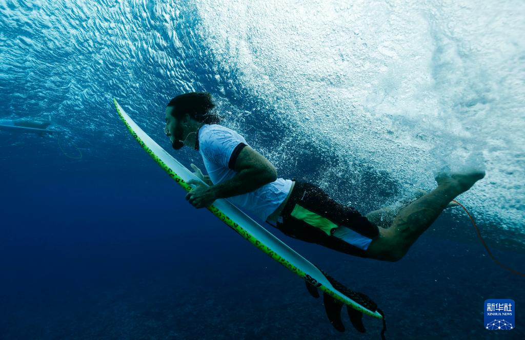 当日,各国冲浪选手在法属波利尼西亚群岛的塔希提训练备战。巴黎奥运会冲浪项目将于7月27日迎来首个比赛日。