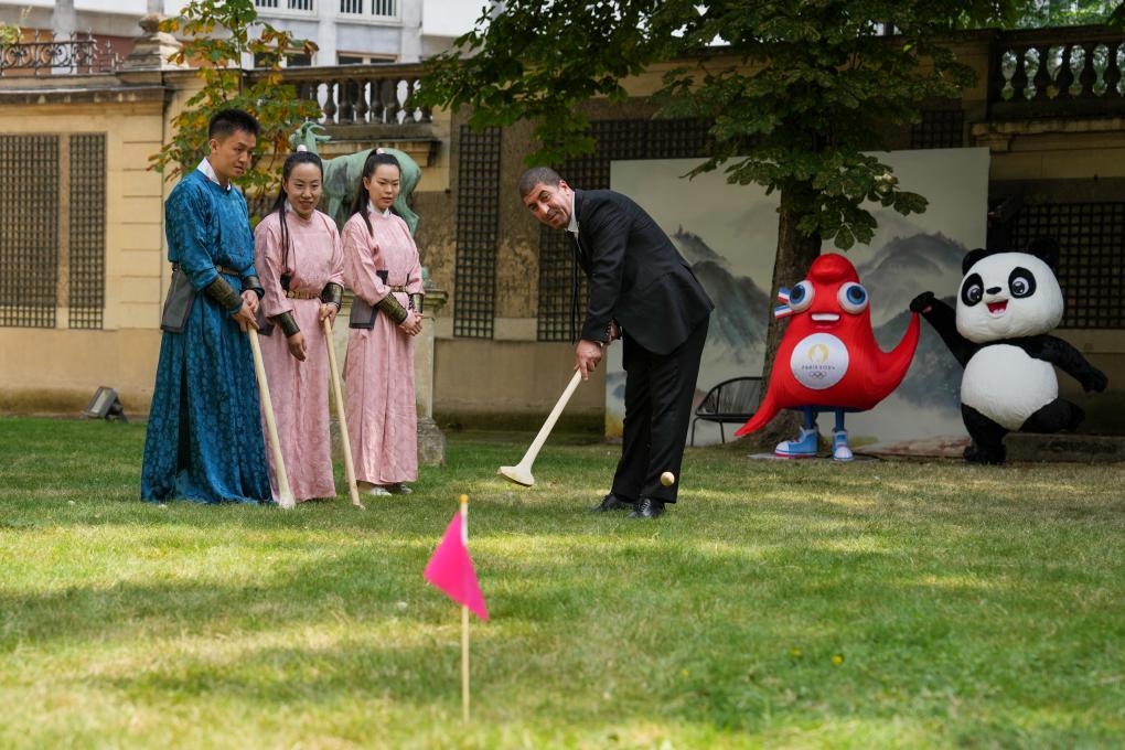 7月24日,一位工作人员(右一)在巴黎奥运会“中国之家”体验传统体育活动“捶丸”。新华社记者 鞠焕宗 摄