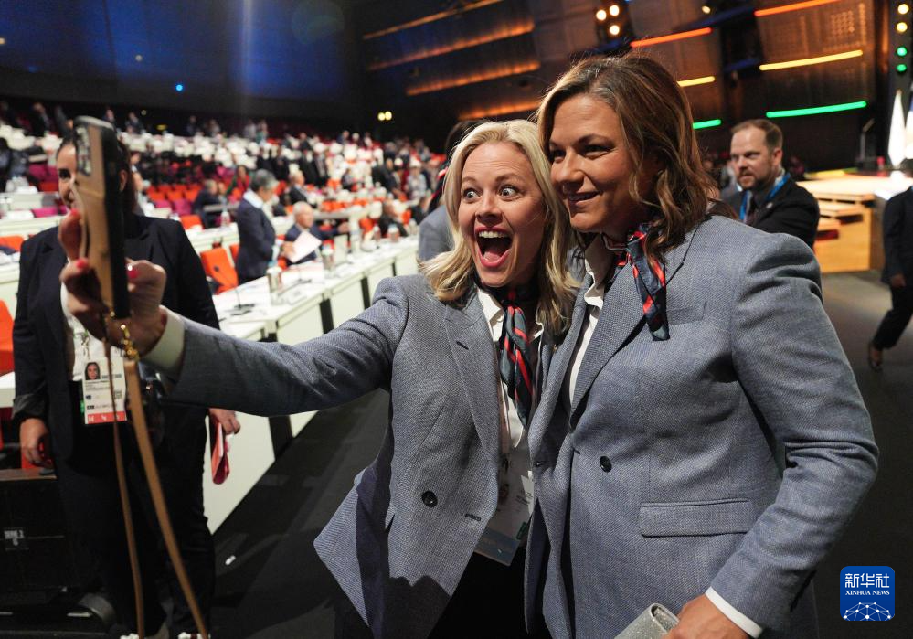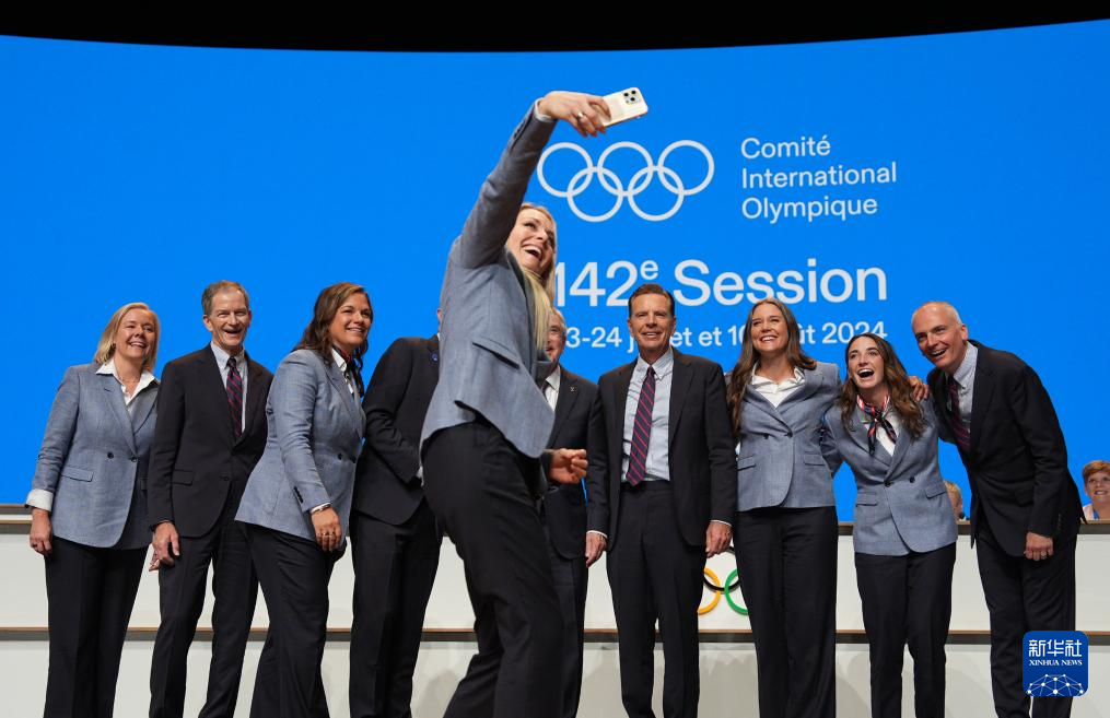 7月24日,美国盐湖城代表团成员在国际奥委会第142次全会前自拍留影。新华社记者 孙非 摄