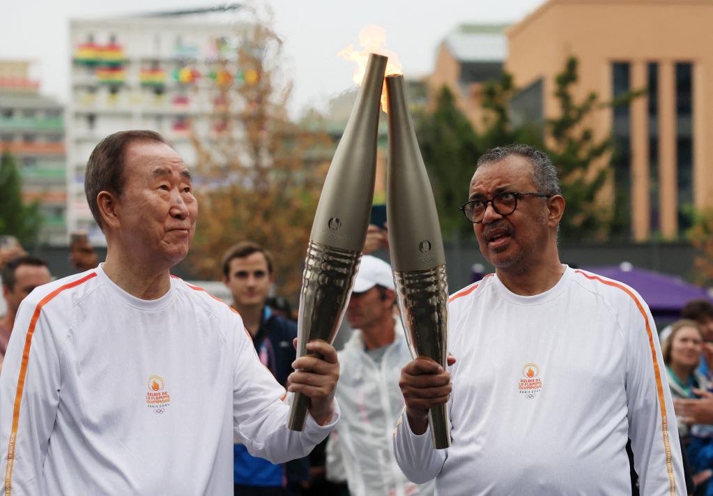 7月26日,2024年巴黎奥运会火炬在奥运村内传递,联合国前秘书长潘基文(左)与世界卫生组织总干事谭德塞在火炬传递中。新华社发(POOL照片/利娅·米利斯)