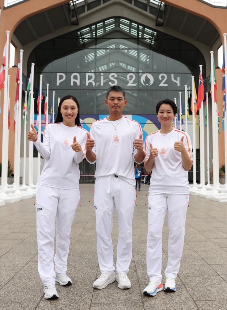7月26日,2024年巴黎奥运会火炬在奥运村内传递,参与火炬传递的国际奥委会委员张虹(左)、中国羽毛球奥运冠军林丹(中)和中国跆拳道奥运冠军吴静钰在火炬传递后合影。新华社记者 贾浩成 摄