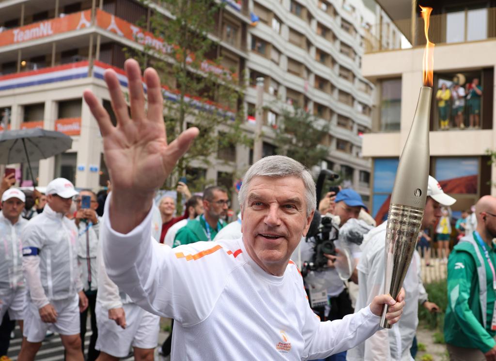 7月26日,2024年巴黎奥运会火炬在奥运村内传递,国际奥委会主席巴赫在火炬传递中。新华社记者 贾浩成 摄