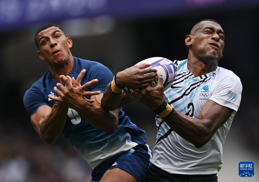 7月25日,斐济队球员乔瑟瓦(右)与法国队球员阿龙拼抢。新华社记者 陶希夷 摄
