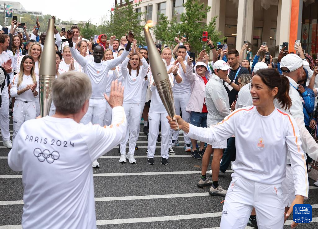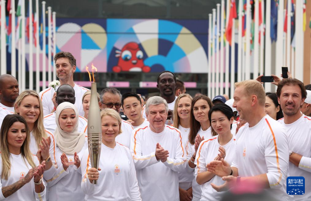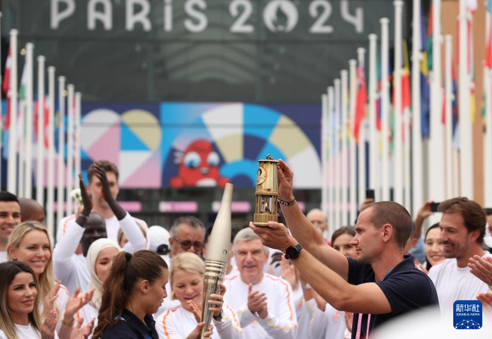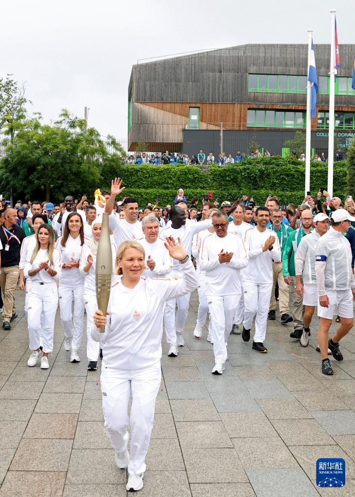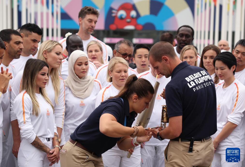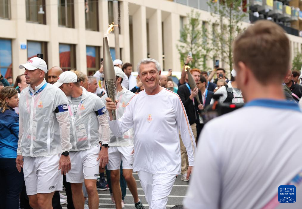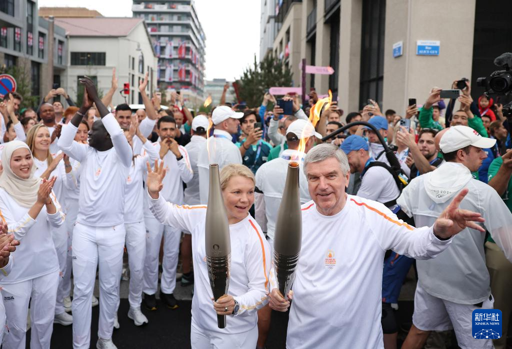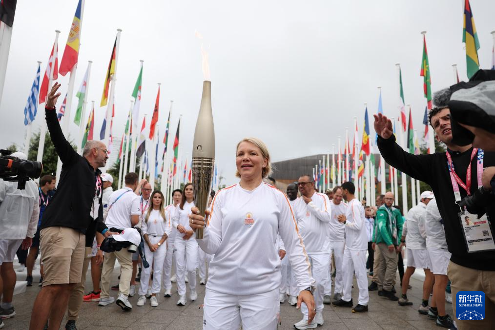 当日,2024年巴黎奥运会火炬在奥运村内传递。