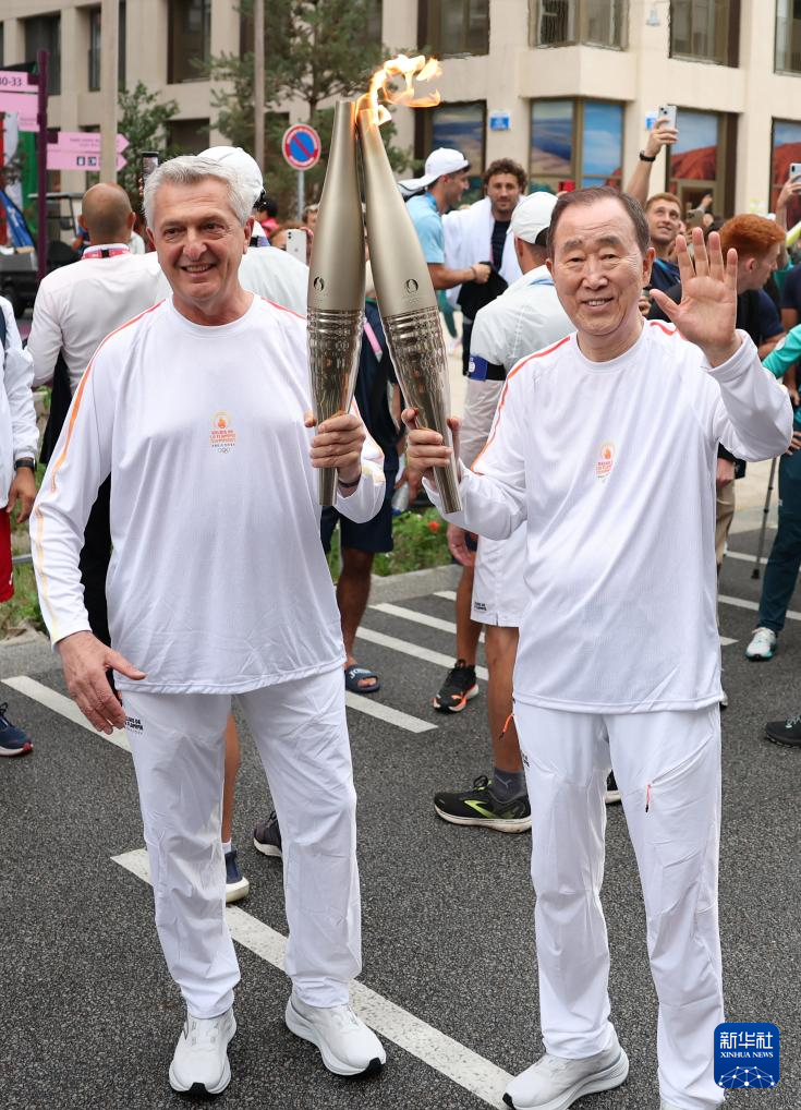 7月26日,联合国难民事务高级专员菲利波·格兰迪(左)与联合国前秘书长潘基文在火炬传递中。新华社记者 贾浩成 摄