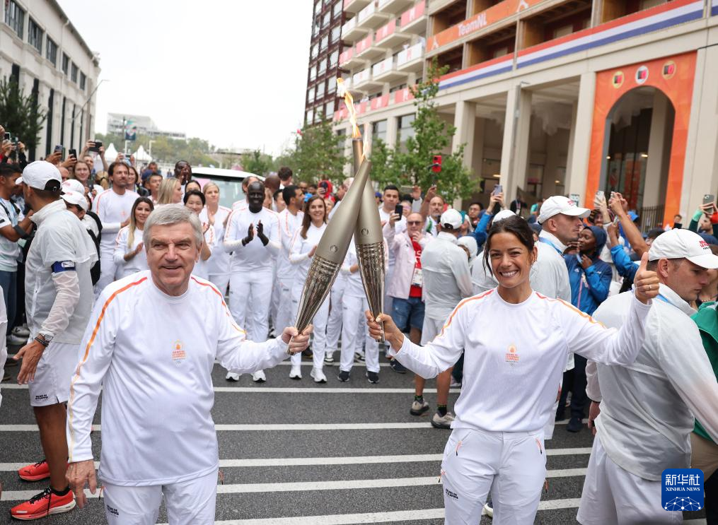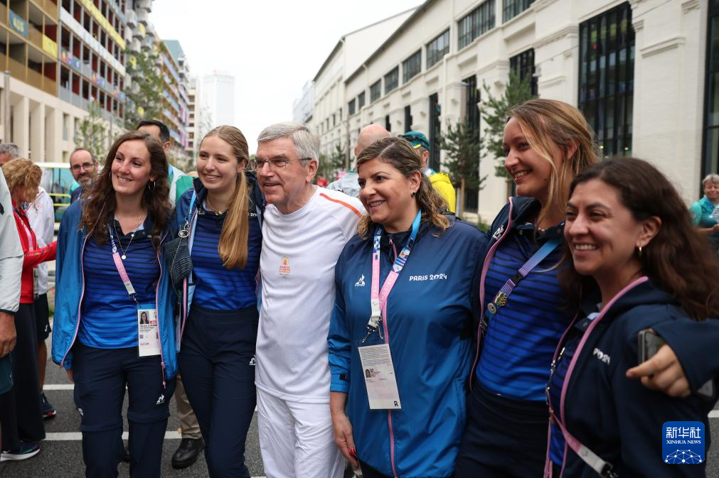 7月26日,国际奥委会主席巴赫(前左)与法国手球运动员克莱奥帕特·达勒(前右)在火炬传递中。新华社记者 贾浩成 摄